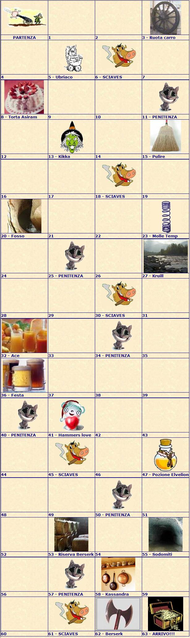 PARTENZA 1. 2. 3. fermo il turno (la ruota del tuo carro s’è rotta) 4. 5. indietro di 3 caselle (hai sbagliato stradaaaaa sei già ubriaco?) 6. SCIAVES 7. 8. avanti di 6 caselle (torta di Asiram sul davanzale, corri a fregar.. ehm a chiedere una fetta) 9. 10. 11. PENITENZA 12. 13. indietro di 6 (hai visto la strega Kikka appena sveglia) 14. 15. fermo il turno (Kristal ti fa pulire il macello che hai lasciato ieri sera in taverna) 16. 17. 18. SCIAVES 19. 20. indietro di 3 (hai beccato un ramo dritto in faccia, sei indietreggiato e cascato a ruzzoloni in un fosso ghghh) 21. 22. 23. avanti di 10 (hai comprato le molle di Temp) 24. 25. PENITENZA 26. 27. indietro di 4 (saltellando tra una pietra e l’altra del Kruill.. sei caduto ahah) 28. 29. 30. SCIAVES 31. 32. avanti di 5 (hai bevuto il succo super vitaminico Ace) 33. 34. PENITENZA 35. 36. fermo il turno (c’è una festa in taverna) 37. 38. 39. 40. PENITENZA 41. avanti di 5 (vedi una bella amazzone/guerriero e le tue gambe corrono da sole 42. 43. 44. 45. SCIAVES 46. 47. indietro di 10 (filtro magico di Elvelion andato a male) 48. 49. 50. PENITENZA 51. 52. 53. avanti di 7 (vedi la riserva segreta di Berserk) 54. 55. fermo il turno (grotta dei sodomiti) 56. 57. PENITENZA 58. Indietro di 6 (Kassandra con le padelle) 59. 60. 61. SCIAVES 62. torna indietro di 15 (hai urtato per sbaglio Berserk.. meglio che scappi) 63. ARRIVO